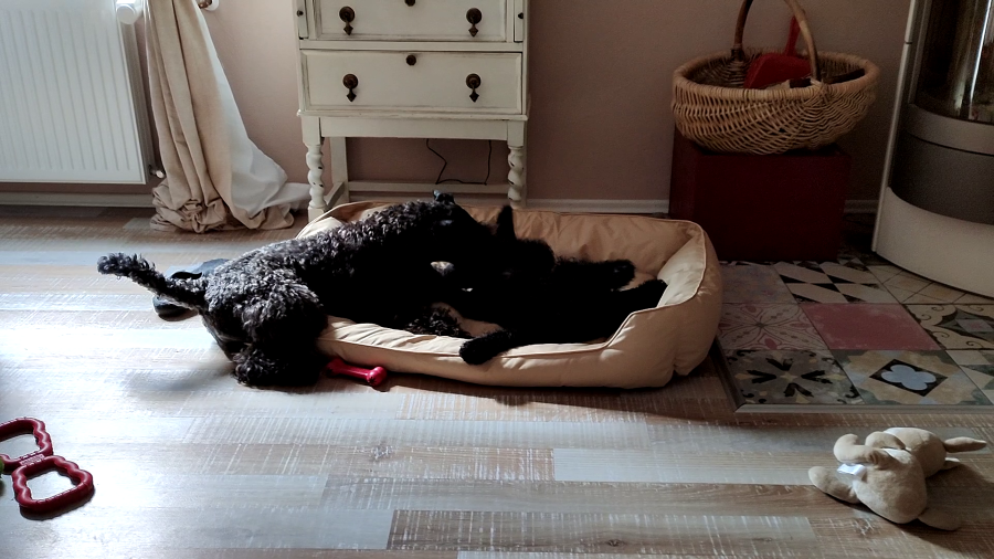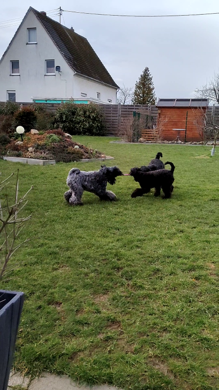 Auf dem ersten Bild unsere drei Kerry's im Februar 2022 in einem Video. Auf dem zweiten Bild unsere Coco mit der Daisy, einem Welpen aus dem D-Wurf im März 2023. Klicken sie auf das jeweilige Bild, um das Video zu starten. Weiter unten können sie sich diverse Bilder anschauen.
